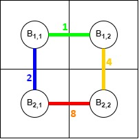 我们用 $B_{i,j}$ 表示第 $i$ 行第 $j$ 列的建筑。