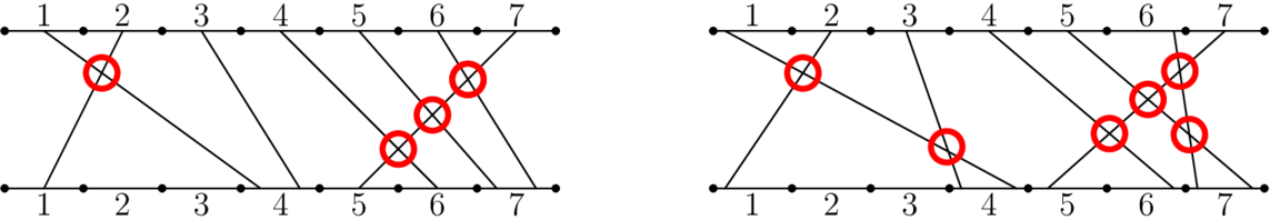 给定一个长度为 $n$ 的数组 $a$。对于所有 $i=1,2,\dots,n$,需要从上方终端的第 $i$ 段的某一点,拉一根直线到下方终端的第 $a_i$ 段的某一点。例如,下图展示了当 $n=7$ 且 $a=[4,1,4,6,7,7,5]$ 时的两种可能的连线方式。