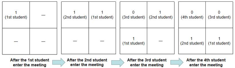 After the $ 3 $ -rd student enters the meeting hall, the $ 4 $ rows and columns are all good.