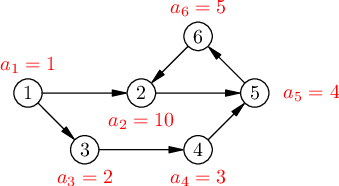 Masha 有一个有向图,第 $i$ 个顶点上写着一个正整数 $a_i$。一开始,Masha 可以选择在某个顶点上放置一枚硬币。每次操作时,她可以将硬币从当前顶点 $u$ 移动到有一条有向边 $u \to v$ 的顶点 $v$。每当硬币停留在某个顶点 $i$ 时,Masha 会把该顶点上的整数 $a_i$ 记在她的笔记本上(特别地,最初放置硬币时也要记录该顶点的整数)。Masha 想要恰好进行 $k-1$ 次操作,使得她笔记本上记录的最大数字尽可能小。