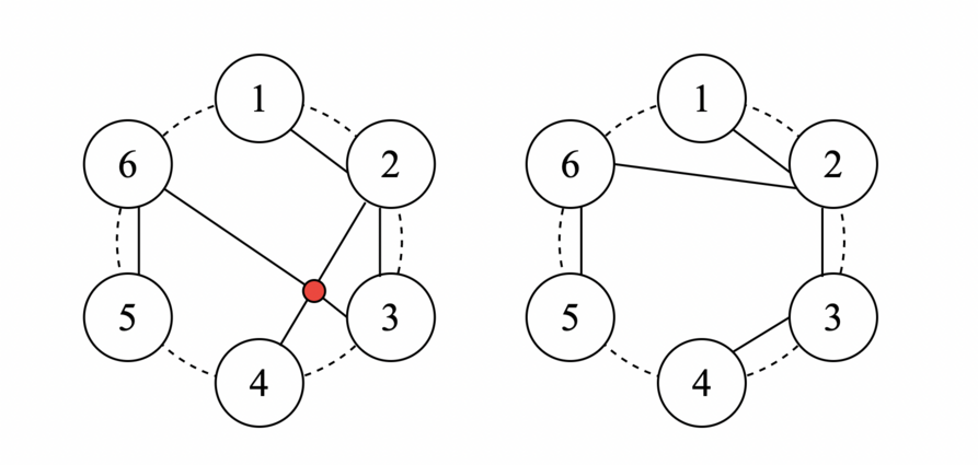 左侧的树满足度数限制,但边在圆内部有交点,因此不是合法的树;右侧的树是合法的。
