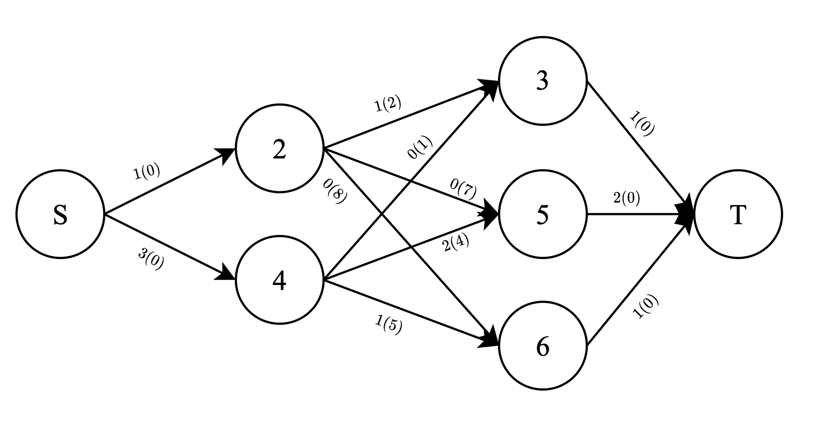 最大流量为 $3$,总代价为 $0 \cdot 3 + 1 \cdot 1 + 4 \cdot 2 + 0 \cdot 1 + 0 \cdot 2 = 9$。
