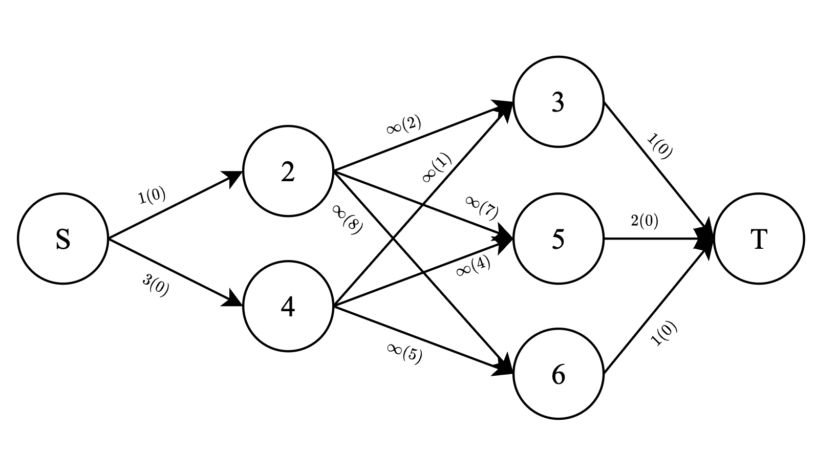 - 再添加两个顶点:源点 $S$ 和汇点 $T$。