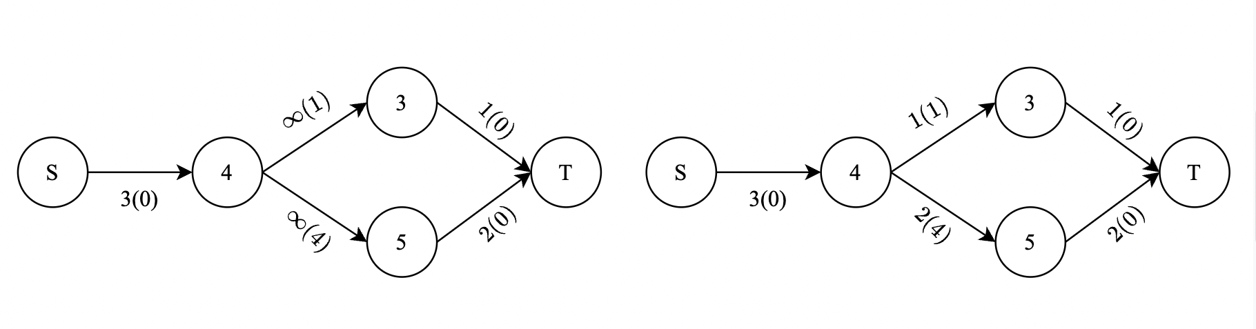在第三个询问中,流网络如左图所示,边上标注了容量,括号内为费用。右图展示了最优流量分配。