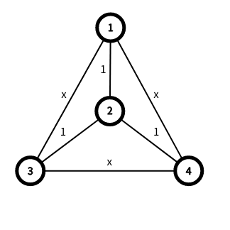 2. 对于所有 $u,v \in L$ 且 $u < v$,在图(初始为给定的树)中添加一条权值为 $x_i$ 的边 $(u, v)$。