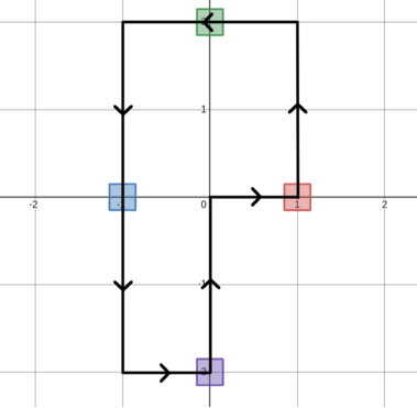 $ $$$(0,0) \to (1,0) \to (1,1) \to (1, 2) \to (0,2) \to (-1,2) \to (-1,1) \to (-1,0) \to (-1,-1) \to (-1,-2) \to (0,-2) \to (0,-1) \to (0,0) $ $