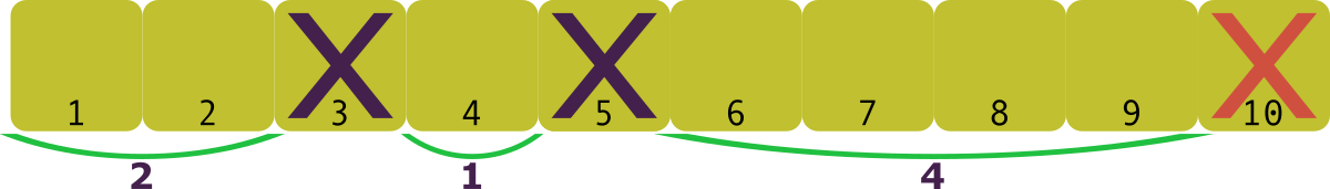 对于第 $2$ 个测试用例,图中展示了一种可能的休息日选择方式。工作区间长度分别为 $2$、$1$ 和 $4$ 天,因此最小差值为 $1 = \min(1, 3, 2) = \min(|2 - 1|, |1 - 4|, |4 - 2|)$。可以证明没有更大的方案。