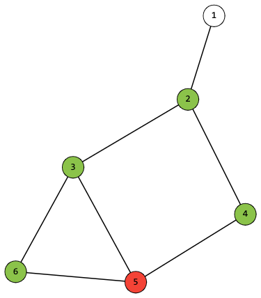 例如,在下图中,住在顶点 $h_i=5$ 的朋友可以顺路送住在以下顶点集合的朋友:$[2, 3]$,$[2, 4]$,$[2]$,$[3]$,$[4]$,但不能顺路送住在顶点 $6$ 的朋友,也不能同时送 $[3, 4]$。