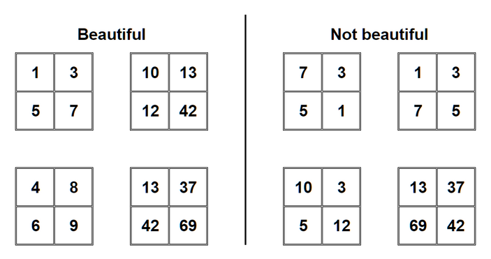 你有一个 $2 \times 2$ 的矩阵,矩阵中的元素都是互不相同的整数。你希望将你的矩阵变得“美丽”。如果矩阵满足以下两个条件,则称其为美丽的: