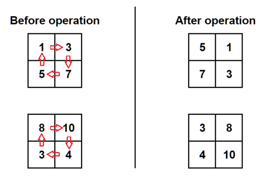 你可以对矩阵进行如下操作任意次:顺时针旋转 $90$ 度。这样,左上角元素会移动到右上角,右上角元素会移动到右下角,依此类推: