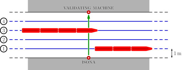 The following picture summarizes the situation. In the picture there are $ m = 4 $ railways and two trains are visible; the train going through railway $ 3 $ is currently crossing the line between Isona and the validating machine.