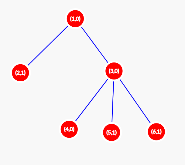我们以初始配置 $A = [0,1,0,0,1,1]$($A[i]$ 表示第 $i$ 个节点的值)为例,计算 $F(A)$。初始时($t=0$),树如下图所示。每个节点中显示了节点编号和节点的值。此时 $S(0)=3$。