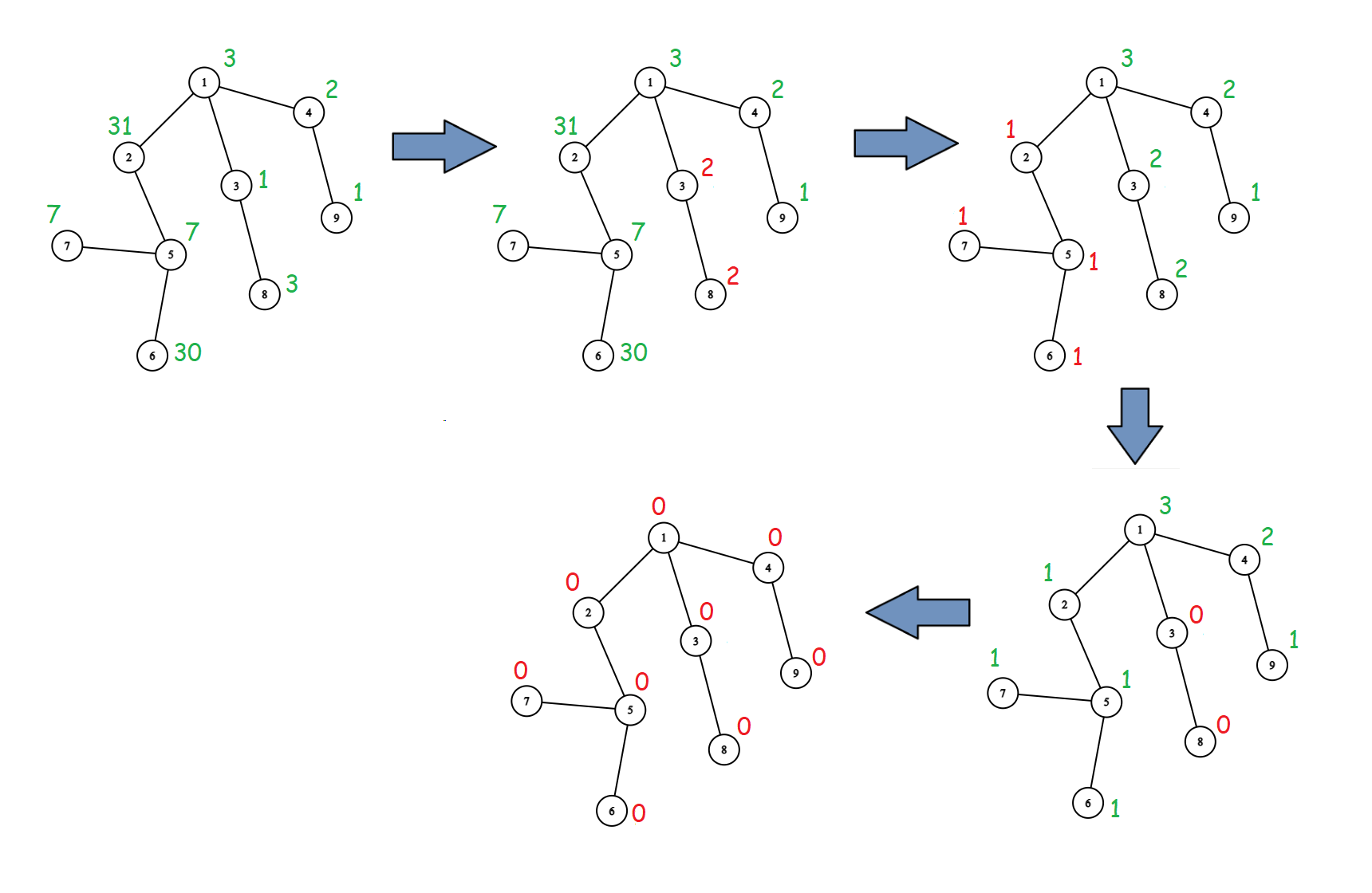 请参考下图理解第三个测试点的解释。只展示了前 $4$ 次施法,因为最后 $2$ 次没有效果。第一张图表示初始树,每个节点上方绿色数字为石头数。当前施法导致的变化用红色高亮。 ![](https://cdn.luogu.com.cn/upload/vjudge_pic/CF1779F/87049d0f1cff376d7b36c99b33f175c4877519fa.png) 由 ChatGPT 4.1 翻译