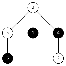 点 $1$ 和 $6$ 之间的距离是 $3$,点 $4$ 和 $6$ 之间的距离是 $3$,点 $1$ 和 $4$ 之间的距离是 $2$。此时树的 positivity 等于这些距离的最小值,即 $2$。