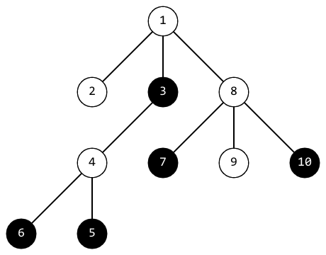 我们定义树的“positivity”为所有不同黑色点对之间的最小距离。点 $v$ 和 $u$ 之间的距离是从 $v$ 到 $u$ 的路径上的边数。