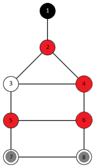 终点为黑色,奖励为红色,棋子为灰色。例如,对于给定的图,你可以通过如下操作序列,将第 $8$ 号顶点的棋子移动到终点: