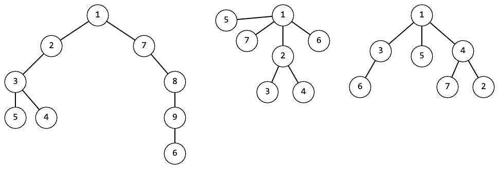 接下来的 $n-1$ 行,每行包含两个整数 $u$ 和 $v$($1 \le u, v \le n$,$u \neq v$),表示一条连接结点 $u$ 和 $v$ 的边。