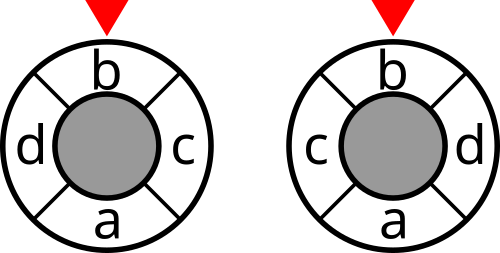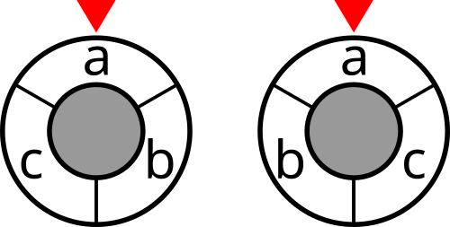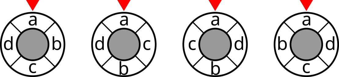 锁的圆周被均分为 $k$ 个区域,这些区域按顺时针顺序从 $1$ 到 $k$ 编号。指针总是指向某一个区域。每个区域都用前 $k$ 个英文字母中的一个字母标记,且没有两个区域标记相同的字母。