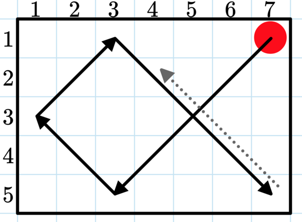 在上面的例子中,小球从 $(1, 7)$ 开始,沿着 $\texttt{DL}$ 方向运动,直到到达底部墙壁,然后反弹并沿着 $\texttt{UL}$ 方向继续运动。到达左侧墙壁后,小球反弹并沿着 $\texttt{UR}$ 方向继续运动。当小球到达上侧墙壁时,反弹并沿着 $\texttt{DR}$ 方向继续运动。到达右下角后,小球反弹一次并沿着 $\texttt{UL}$ 方向继续运动,依此类推。