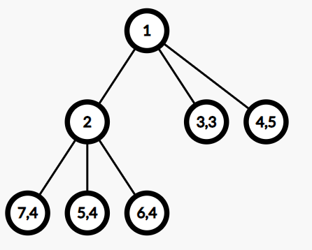可以看出,$\mathrm{dep}_3=\mathrm{dep}_4=1,\mathrm{dep}_5=\mathrm{dep}_6=\mathrm{dep}_7=2$,树的值(所有叶子的最大值)为 $5+1=6$。叶子 $5$、$6$、$7$ 的值也等于 $6$。可以证明,这棵树的值在所有合法树中是最小的。