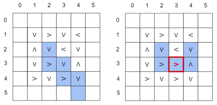 这是 $n=4$ 时某次查询的可能结果。此时箱子从 $(2, 2)$ 出发。如果没有卡住的传送带,它最终会停在 $(5, 4)$,但由于 $(3, 3)$ 处的传送带卡住并向右(`>`),箱子进入了无限循环。