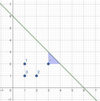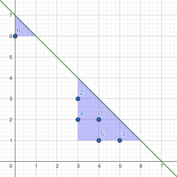 在一个二维平面上有 $n$ 个两两不同的点和一条直线 $x+y=k$。第 $i$ 个点的坐标为 $(x_i, y_i)$。所有点的坐标都是非负数,并且严格在该直线下方。换句话说,$0 \leq x_i, y_i$,且 $x_i + y_i < k$。