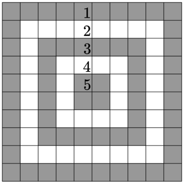 一个 $10 \times 10$ 的靶子由如图所示的五个“环”组成。每个环有不同的分值:最外层环为 1 分,下一层为 2 分,依此类推,中心环为 5 分。