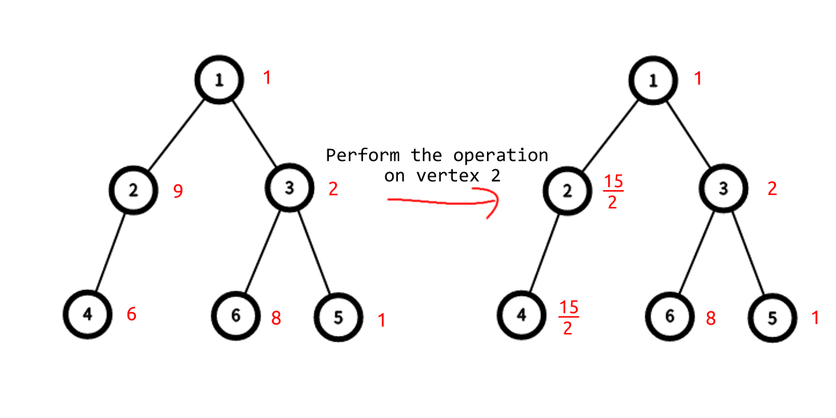 选择一个节点 $x$,令 $s$ 为 $x$ 子树内所有点权值的平均值,把 $x$ 子树内所有点的权值修改为 $s$。