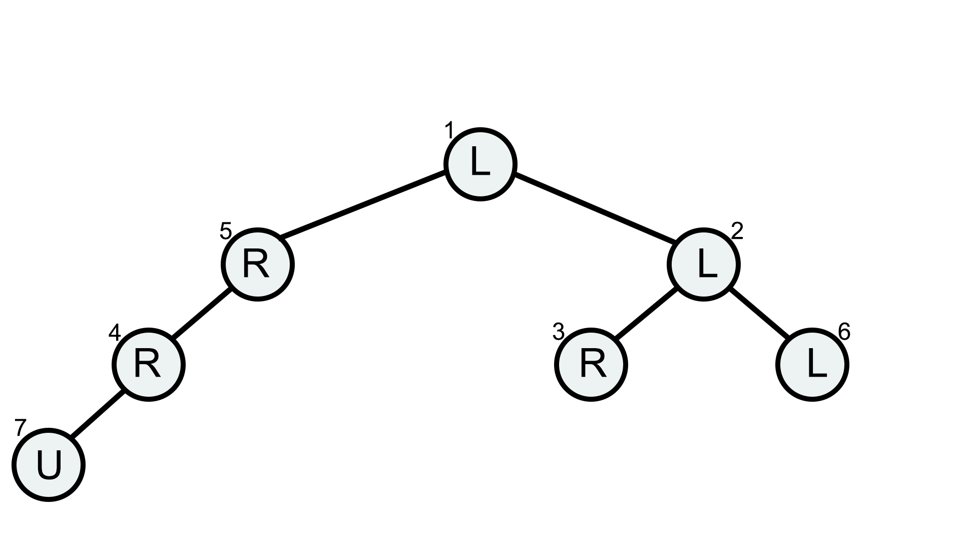 此外,每个结点上都写有一个字母 $s_i$,该字母为 'U'、'L' 或 'R'。