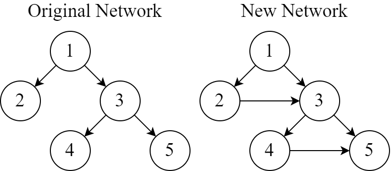 下图展示了原始网络以及灾难发生时添加新网线后的新网络。唯一满足条件的排列为 $[1, 2, 3, 4, 5]$。