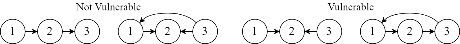 对于不脆弱的网络,左侧和右侧网络唯一满足条件的排列分别为 $[1, 2, 3]$ 和 $[3, 1, 2]$。而对于脆弱的网络,左侧网络有 $2$ 个满足条件的排列:$[1, 2, 3]$ 和 $[3, 1, 2]$;右侧网络则没有任何满足条件的排列。