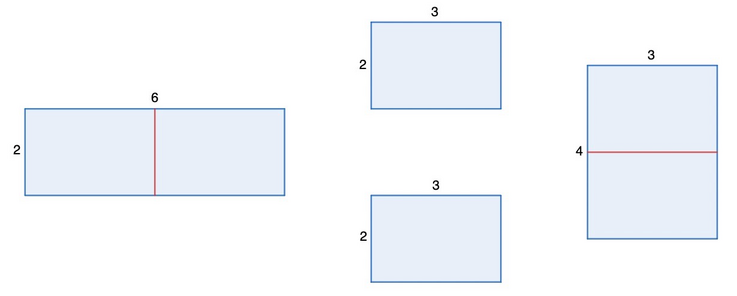 在第四个测试用例中,$3 \times 2$ 的矩形可以切成两个 $3 \times 1$ 的矩形,然后用这两个矩形拼成 $1 \times 6$ 的矩形。
