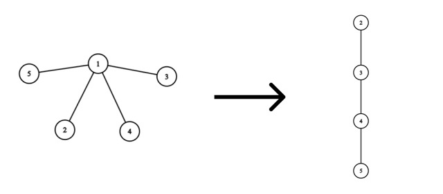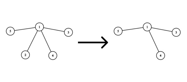但事情并不简单。提莫菲大师决定从树中偷走一个顶点。如果提莫菲从树中移除顶点 $v$,那么顶点 $v$ 以及所有与 $v$ 相连的边都会被从树中移除,其他顶点的编号保持不变。为了不让安德烈伤心,提莫菲决定让剩下的图再次成为一棵树。为此,他可以在任意两个顶点 $a$ 和 $b$ 之间添加边,但每添加一条边,他都需要向大师援助中心支付 $|a-b|$ 个金币。