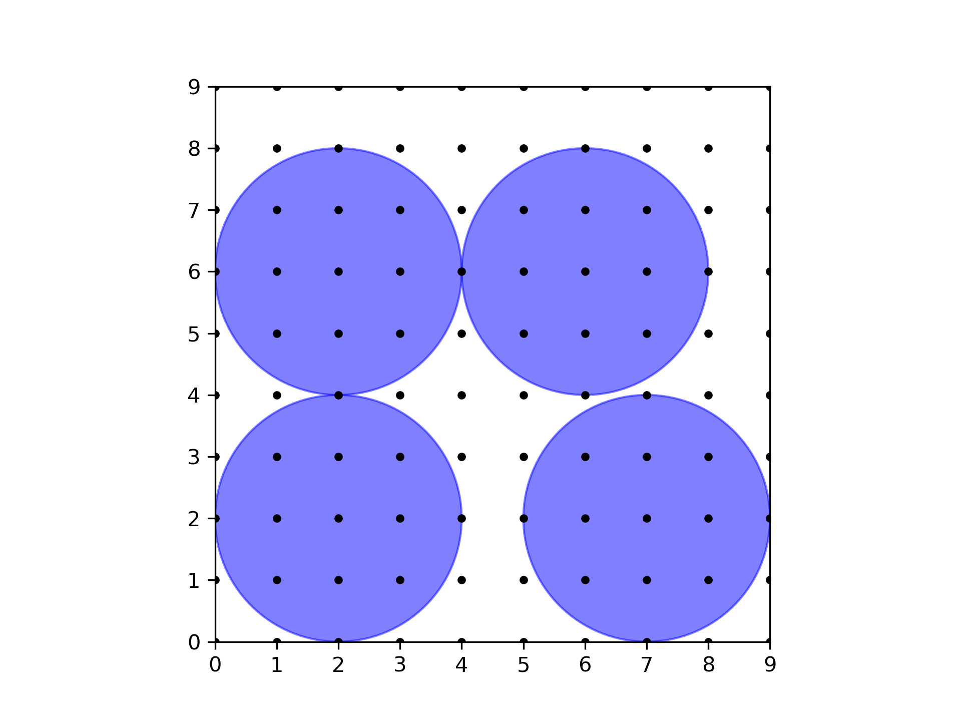 你想在一个边长为 $ n $ 的正方形草坪上种树。这个草坪的四个角在笛卡尔坐标系下的坐标分别是 $ (0, 0) $、$ (n, 0) $、$ (0, n) $ 和 $ (n, n) $。树只能种在整数坐标的位置上。每棵树的根系会向周围扩展,覆盖一个以该位置为中心、半径为 $ r $ 的圆形区域。这个圆形区域必须完全位于草坪内部(可以接触草坪的边界),此外,圆形区域之间只能在边缘接触,不能重叠。