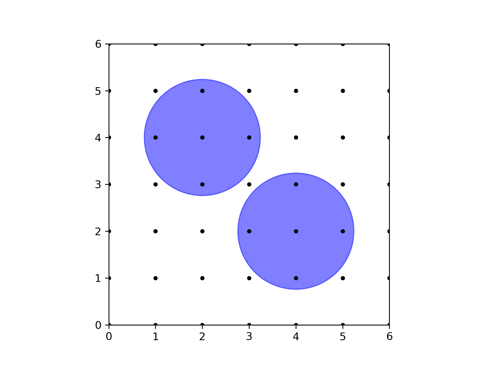 输入包含一行,给出一个整数 $ n $($ 1 \leq n \leq 20 $)和一个实数 $ r $($ 0 < r \leq n/2 $)。这两个数分别表示草坪的边长和每棵树根系生长的圆盘半径。半径 $ r $ 以小数形式给出,小数点后的位数至少 1 位,最多 3 位。
