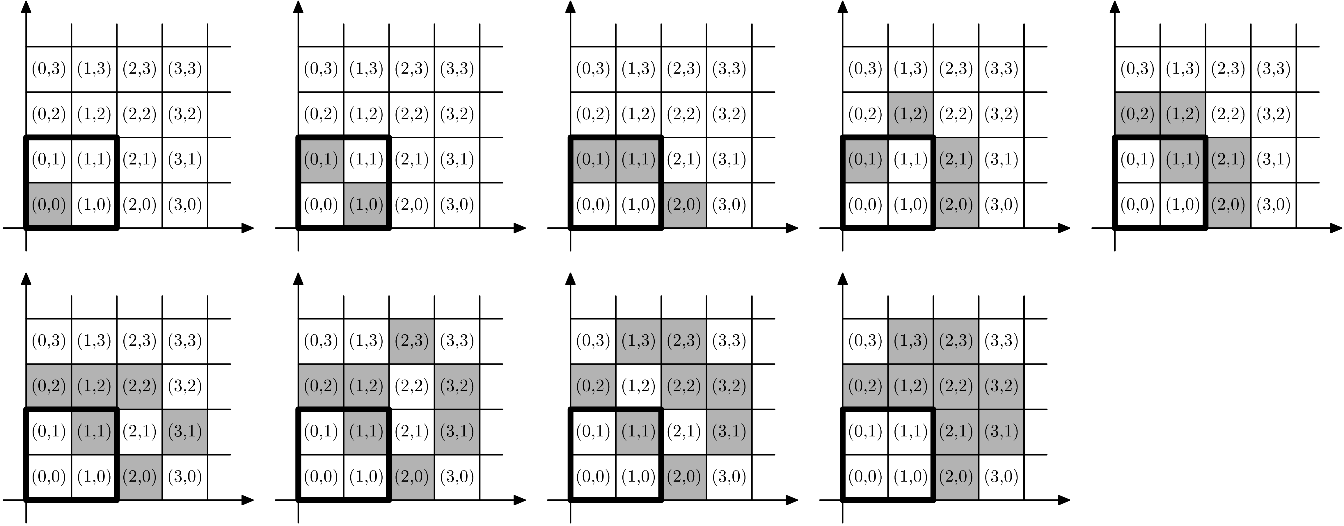 在第一个测试用例中,按照如下顺序分裂细胞,可以得到一个不包含任何禁止出现细胞的生物体:$(0, 0)$、$(1, 0)$、$(1, 1)$、$(0, 1)$、$(2, 1)$、$(2, 2)$、$(1, 2)$、$(1, 1)$。下图展示了生物体在此过程中如何变化: