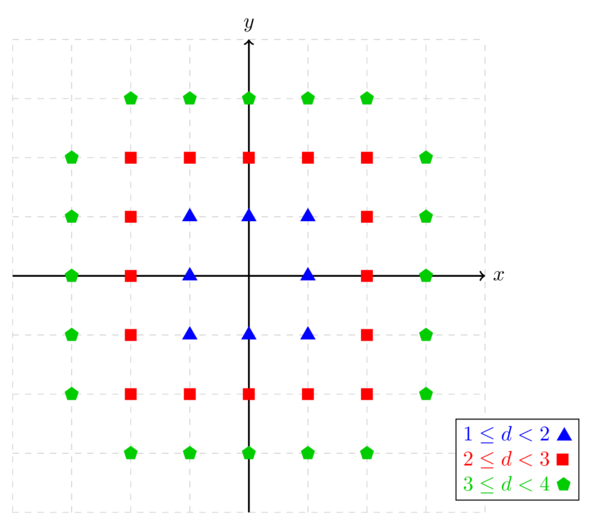 一个整点是指横纵坐标均为整数的点。点 $(x, y)$ 与原点 $(0, 0)$ 的欧几里得距离为 $\sqrt{x^2 + y^2}$。