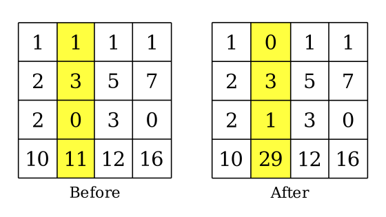 如图所示,对矩阵的第 $2$ 列进行一次操作后,该列所有元素发生了变化: