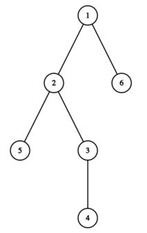 上图中的树满足条件。例如,结点 $2$ 的子树中,结点编号为 $2, 3, 4, 5$,是连续的整数。 下图中的树不满足条件,因为结点 $2$ 的子树中,结点编号 $2$ 和 $4$ 不是连续的整数。