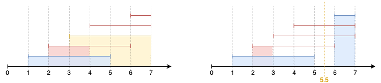 - 在测试用例 5 中,区间着色如下图所示。右侧图是错误的着色示例;在时间点 $ 5.5 $ 时,没有唯一颜色: