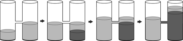 由于粘土具有黏性,当粘土的高度足够时,它会封住管道。更确切地说,如果管道的高度为 $h$,当粘土的高度达到或低于 $h$ 时,管道仍然能正常工作。然而,一旦你向水桶中多加了一单位的粘土,管道就会立刻被封住,阻止水在水桶之间流动。