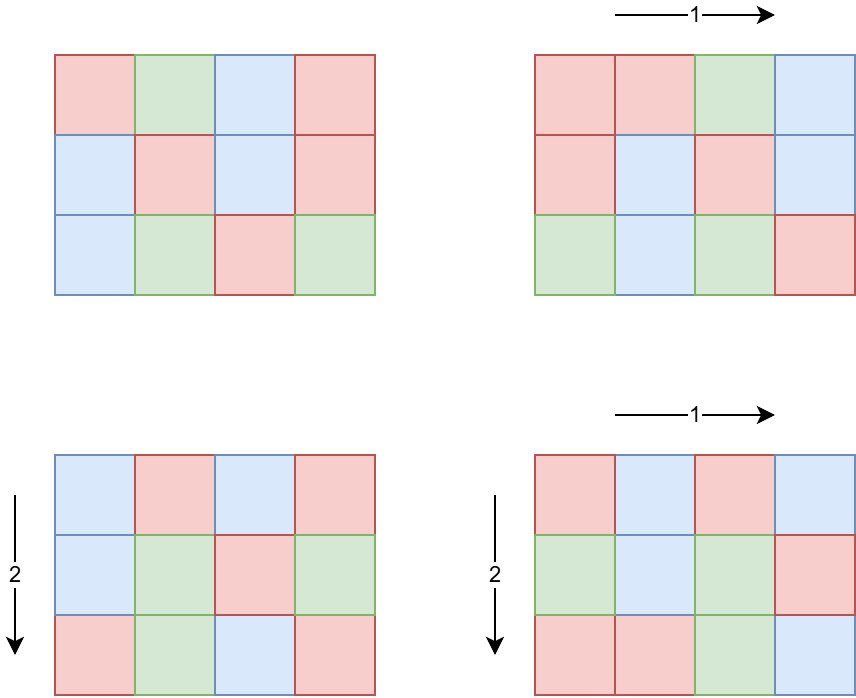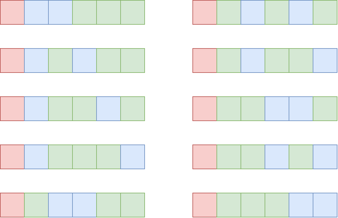 有一个长方体,其长、宽、高分别为 $a$、$b$ 和 $c$,由 $k$ 种不同颜色的单位立方体填充组成。我们可以对这个长方体在任意三个方向执行任意次数的循环移位 $^{\text{∗}}$。 其中,第 $i$ 种颜色的单位立方体数量为 $d_i$(其中 $1 \le i \le k$)。请问:用这些立方体可以拼成多少种不同的长方体结构,使得没有哪两种结构可以通过任意组合的循环移位变得相同? $^{\text{∗}}$ 如图所示: - 左上角是原始长方体的俯视图(下层与顶层保持同样的移动方式)。 - 右上角是向右移动 $1$ 格后的长方体俯视图。 - 左下角是向下移动 $2$ 格后的长方体俯视图。 - 右下角是分别向右移动 $1$ 格并向下移动 $2$ 格后的长方体俯视图。 ![](https://cdn.luogu.com.cn/upload/vjudge_pic/CF2040F/de74a785103946b144cfadd0ee59410c014cc2b0.png)
