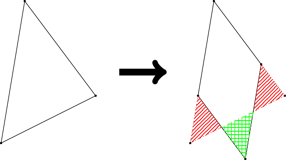 In the example above, A-Ju's castle is a shape of the convex polygon formed by points $ (3, 7) - (2, 1) - (6, 3) $ . After rebuilding her castle into the shape of the polygon formed by $ (3, 7) - (\frac{7}{3}, 3) - (\frac{13}{3}, \frac{1}{3}) - (5, \frac{13}{3}) $ , the area of the symmetric difference between these two polygons will be $ \frac{11}{3} $ . The difference can be calculated as the sum of the additional area (represented by the green grid region) and the shaved area (represented by the red line region).
