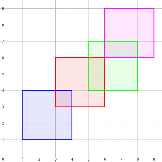 其中,第一次按压形成的正方形为蓝色,第二次为红色,第三次为绿色,第四次为紫色。合并后的区域如下图所示: