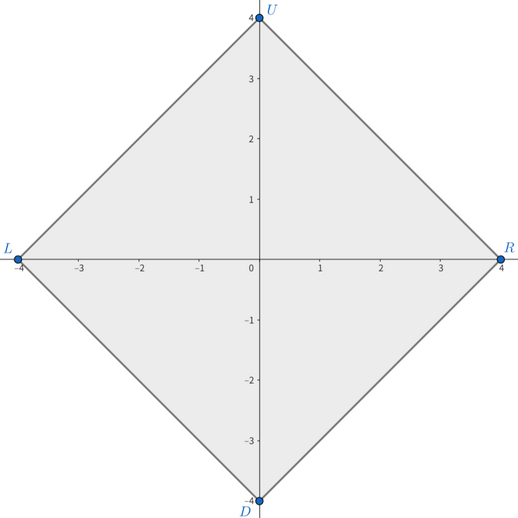 在图中,通过连接四个点 $L$、$R$、$D$、$U$ 绘制了一个正方形。请判断是否可以使用给定的四个点作为顶点绘制一个正方形$^{\text{∗}}$。