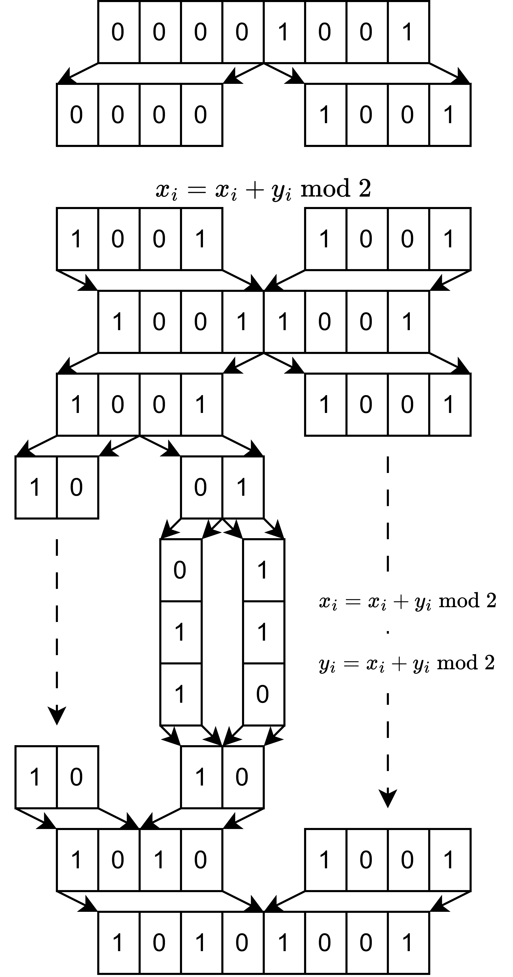 - 对于每个 $i \in \left\{ 1, 2, \ldots, \frac{m}{2}\right\}$,令 $x_i = (x_i + y_i) \bmod 2$;