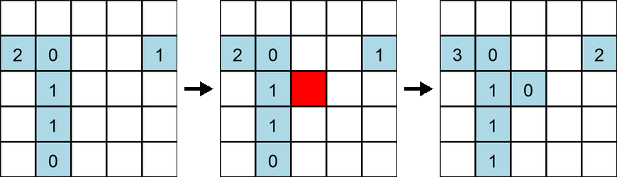 上图展示了在 $5 \times 5$ 网格中染色中心格子后各格子的惩罚变化。数字表示各格子的惩罚次数。