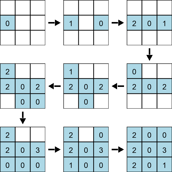 有一个 $n \times m$ 的网格,初始时每个格子都是白色的。你需要依次为所有格子染色。每当你染色一个格子时,所有距离它最远的已染色格子会受到一次惩罚。请你给出一种染色顺序,使得没有任何格子的惩罚次数超过 $3$。