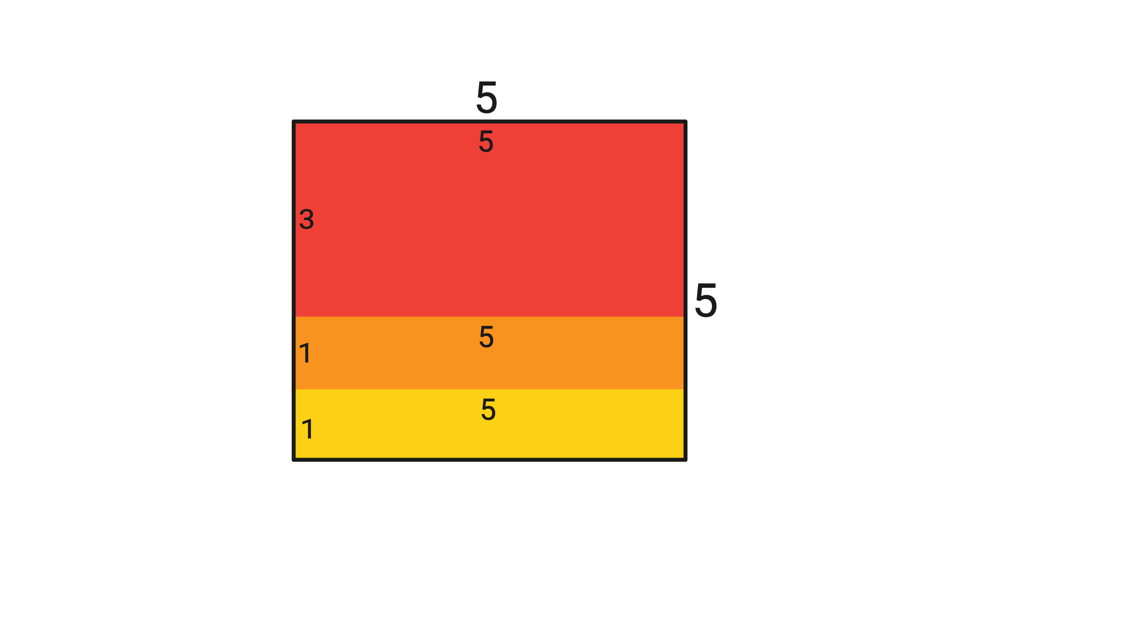 在第二个测试用例中,三个矩形 $5\times 3$、$5\times 1$ 和 $5\times 1$ 可以如下图所示排列成一个正方形。
