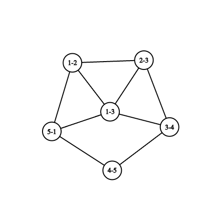 For the second test case, $ L(G) $ looks as follows(Vertex $ i-j $ of $ L(G) $ in figure corresponds to edge between vertices $ i $ and $ j $ of $ G $ ). It can be proven that this doesn't have an Euler trail.
